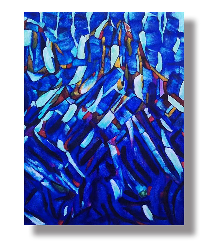 짙은 파랑을 중심으로, 흰색과 붉은빛, 노란빛이 리듬감 있게 얽혀 있습니다.