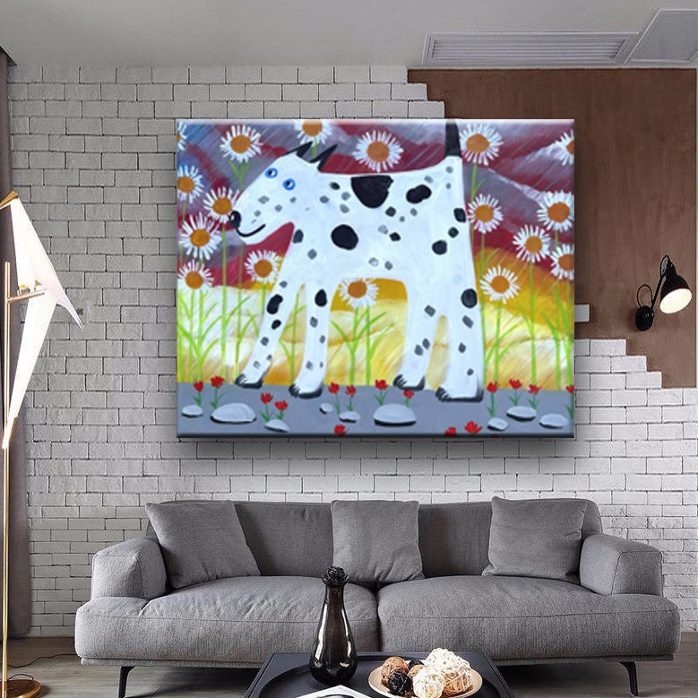 - 밝고 경쾌한 분위기: 선명한 색감과 귀여운 강아지 그림은 거실, 아이 방, 현관 등 공간에 활력과 따뜻함을 불어넣습니다.