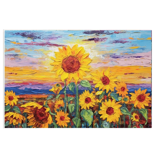 이 작품은 따스한 석양빛 아래 활짝 핀 해바라기밭을 표현한 풍경화로,
