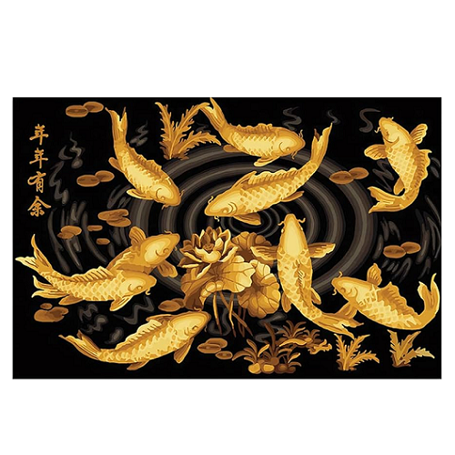 검은 바탕 위에 황금빛 잉어 9마리가 연꽃을 중심으로 유영하는 길상(吉祥) 그림입니다.