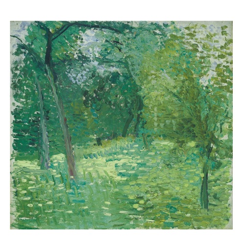 생동감 있는 초록 숲을 거친 붓터치로 표현한 힐링 풍경화입니다.