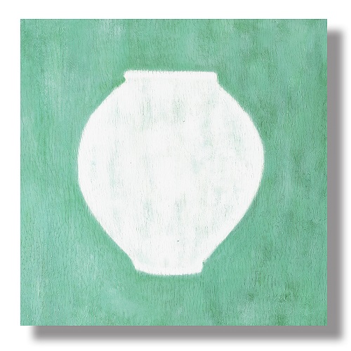 - 특징: 부드러운 흰색 달항아리 실루엣과 차분한 청록색 질감 배경의 대비가 특징입니다. 완벽한 대칭보다는 은은한 비대칭의 자연스러운 아름다움(무심한 듯한 아름다움)을 강조하며, 보는 이에게 평온함과 고요함을 선사합니다