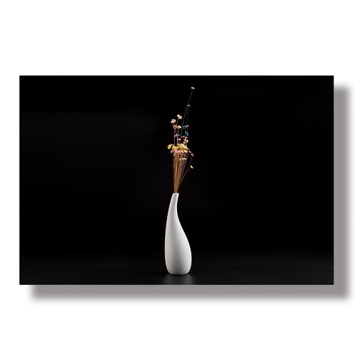 심플한 화이트 화병과 블랙 배경이 조화된 미니멀 정물아트.