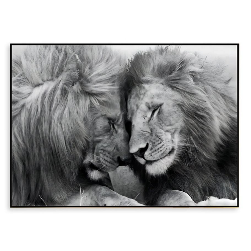 두 사자의 깊은 교감을 담은 흑백 인테리어 액자.