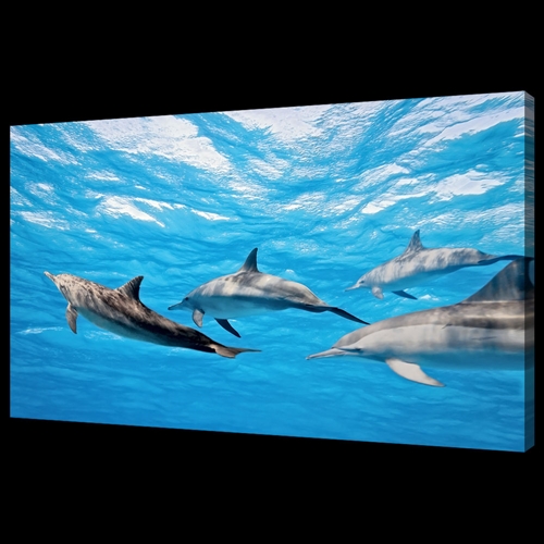투명하고 깊은 푸른 바닷속에서 여러 마리의 돌고래가 활기차게 유영하는 모습을 생생하게 포착한 사진입니다. 빛이 부서지는 수면 아래로 역동적으로 움직이는 돌고래 떼는 자유로움과 생명력을 상징합니다. 풍수지리적으로 돌고래는 행운, 가족애, 사랑, 그리고 금전운을 불러오는 길한 동물로 여겨집니다. 뱃사람들에게는 행운의 상징으로도 알려져 있습니다.