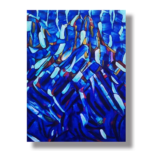 짙은 파랑을 중심으로, 흰색과 붉은빛, 노란빛이 리듬감 있게 얽혀 있습니다.