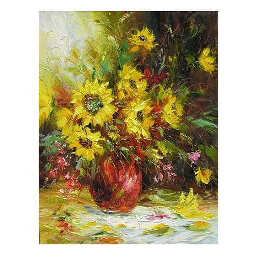 이 작품은 풍성한 해바라기를 주제로 한 화사한 유화 정물화로,