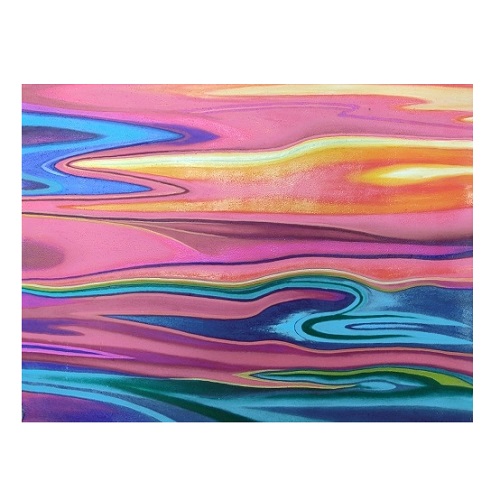 핑크·보라·블루·그린 등이 유려하게 흐르며 공간을 채우는 유동적 추상 작품입니다.