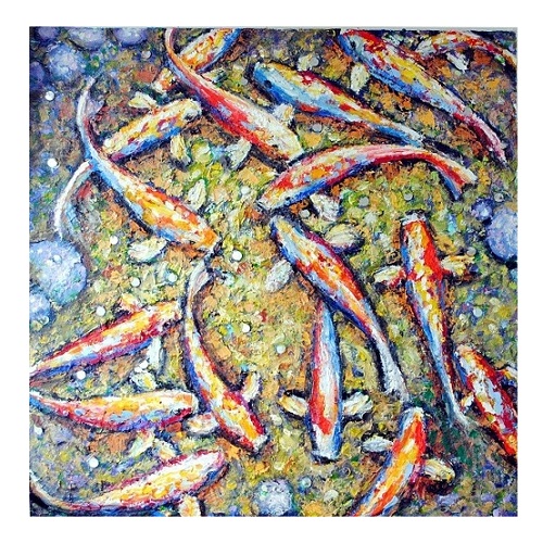이 작품은 다채로운 붓 터치와 질감이 인상적인 **잉어 그림**으로,