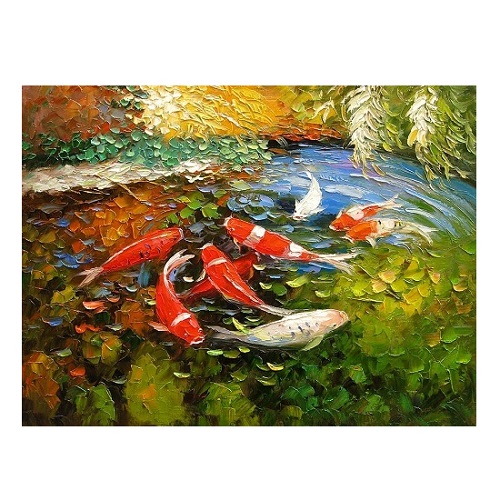 붉은·흰 비단잉어가 유영하는 연못을 풍부한 유화 질감으로 표현한 작품입니다.