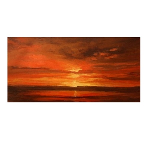 수평선 너머로 타오르는 노을의 에너지를 담아냈습니다. 짙은 오렌지와 레드, 그리고 구름 사이로 비치는 황금빛 햇살의 대비는 단순한 풍경화를 넘어 자연의 관능적이고 원초적인 생동감을 선사합니다. 대담한 붓터치와 풍부한 색채감은 공간에 드라마틱한 예술적 아우라를 부여합니다