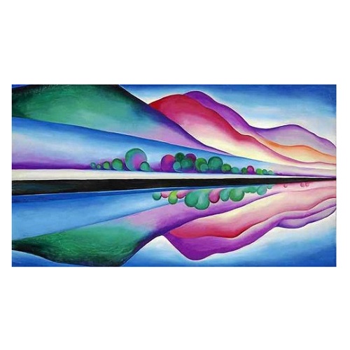 그림 속에는 푸른 산맥과 붉은 하늘, 그리고 수면에 비친 대칭이 완벽한 반영으로 표현되어 있습니다.