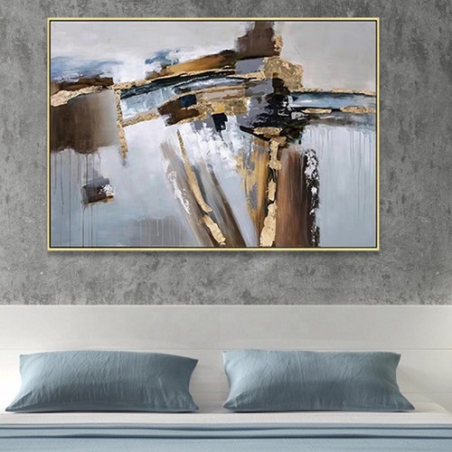 중후한 브라운과 세련된 그레이 컬러의 레이어 위에 눈부신 황금빛 텍스처를 얹어 현대적인 화려함을 극대화한 작품입니다. 대담하게 가로지르는 붓 터치와 입체감 있는 골드 리프 기법은 빛의 각도에 따라 변화하는 깊이감을 선사하며, 절제된 색채 대비 속에서 일상의 품격과 예술적 영감을 동시에 전합니다